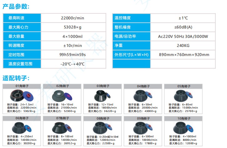 产品介绍 应用领域: 广泛应用于制药厂、生物化学,生物制品等生产、科研单位使用,可最大批量进行蛋白沉淀,细胞分离收集等实验。 产品特性: 1.钢制机身,大力矩交流变频电机驱动,具有噪音低、震动小、安全可靠等优点。 2.可程式大屏幕触摸控制和按键双控系统,带密码功能,可显示:转速,离心力,运行时间,故障显示,运行曲线等;中英文可切换。 3.采用先进的CPU控制系统,100组10段梯度离心,均可自定义,满足用户不同实验需求。 4.配备RS485通讯接口,可USB导出≥1000条运行记录,方便查看追踪,高效管理数据。 5.智能节能功能,待机自动进入低功耗状态,节能降耗。 6.转子自动锁紧功能,无需人为拧紧转头,转子自动识别系统,防止上错转子运行,有效保护人员安全及离心机的稳定性。 7.采用进口高效环保制冷系统,带一键预冷功能,制冷速度快,噪音低,温控精度高。 8.配有门盖保护、超速、过流和先进的电子式不平衡探测系统等安全设计,可以对离心机过程实时监控,确保仪器安全运行。